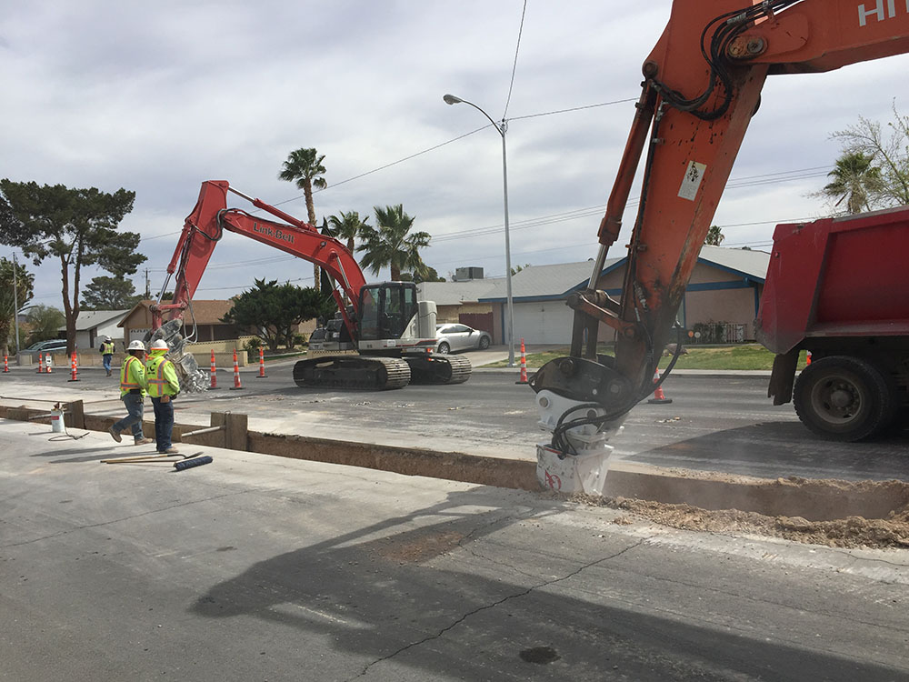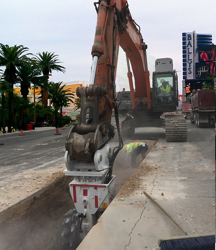 Pipeline excavation in Las Vegas, Nevad using the AQ-3XL on Linkbelt 210 and an AQ-4 on Hitachi 350. The Antraquip cutters efficiently cut the hard caliche on this project.